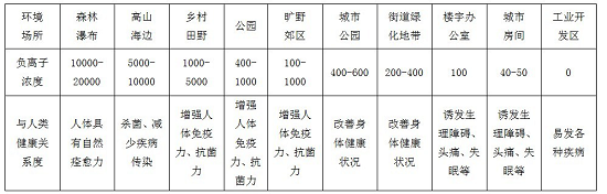 关于空气负离子对室内环境的积极作用,国家林业局经济发展研究中心副主任王焕良曾引用一组数据介绍称,城里人待得最多的地方——城市房间里的负离子浓度是每立方米100个,楼宇办公室里的浓度甚至低到每立方厘米40~50个(根据世界卫生组织划定的标准,清新空气的负氧离子浓度含量为每立方厘米空气中不低于1000~1500个),这些空气往往容易诱发头痛失眠等不适症状。而森林、瀑布和海边等地方的空气负离子含量很丰富,能达到每立方厘米5000~20000个,所以人们走近这些地方的时候,就会感觉到空气特别的清新,令人神清气爽。